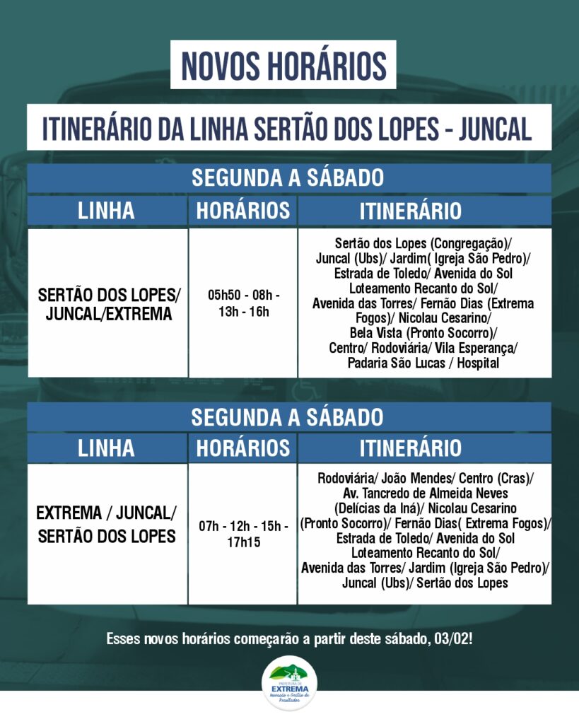 A Sertão dos Lopes x Juncal x Extrema contará com idas às 5h50, 8h, 13h e 16h, enquanto a Extrema x Juncal x Sertão dos Lopes terá voltas às 7h, 12h, 15h e 17h15, de segunda a sábado. Os itinerários não foram alterados, de modo que os pontos de embarques e desembarques continuam nos mesmos locais.