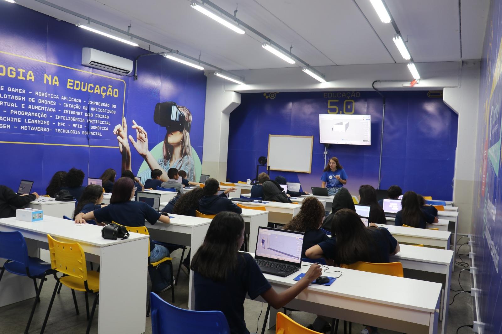 O laboratório conta com uma estrutura moderna e adaptada, equipada com kits de robótica educacional, computadores, dispositivos digitais, impressoras 3D, recursos de realidade virtual e aumentada, além de games educativos e ferramentas de inteligência artificial.